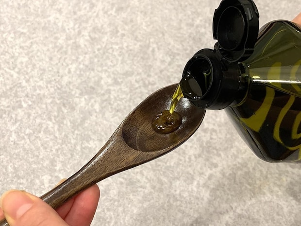 原材料は食用オリーブ油のみで、オリーブ果実本来の豊かな風味を存分に味わえます。スプーンに取ると現れる鮮やかな緑色は、そのフレッシュさを物語っています。