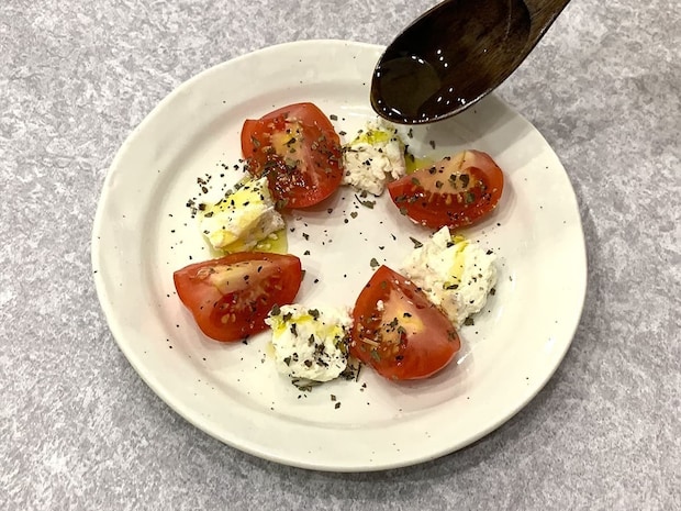 実際にカプレーゼにかけてみると、オリーブオイル特有のフルーティーで青々しい香りが食欲を刺激し、トマトの赤、チーズの白とのコントラストも美しい一皿に仕上がります。