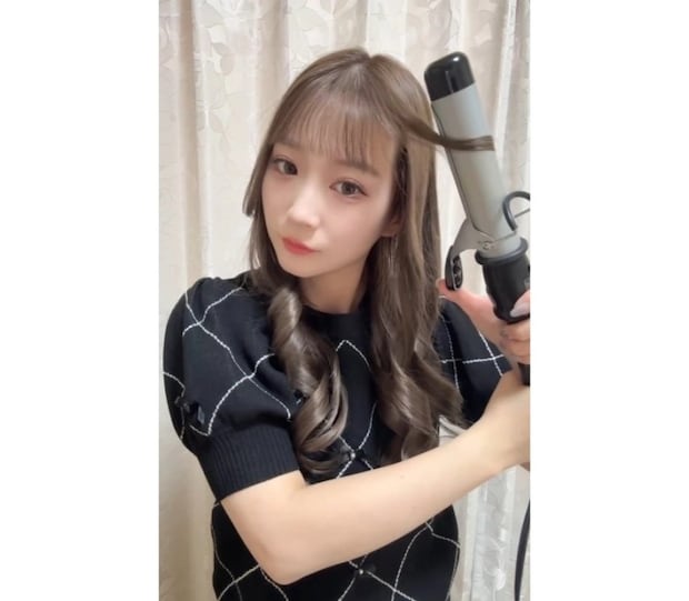 全体を巻き終わったら、顔周りの毛をとってこれも外巻きにサッと巻きます。