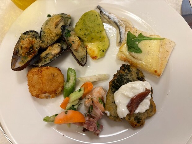 プーリアならではのアンティパスト、いろいろな料理を少しずつ味わえるのが嬉しい大満足の前菜です。