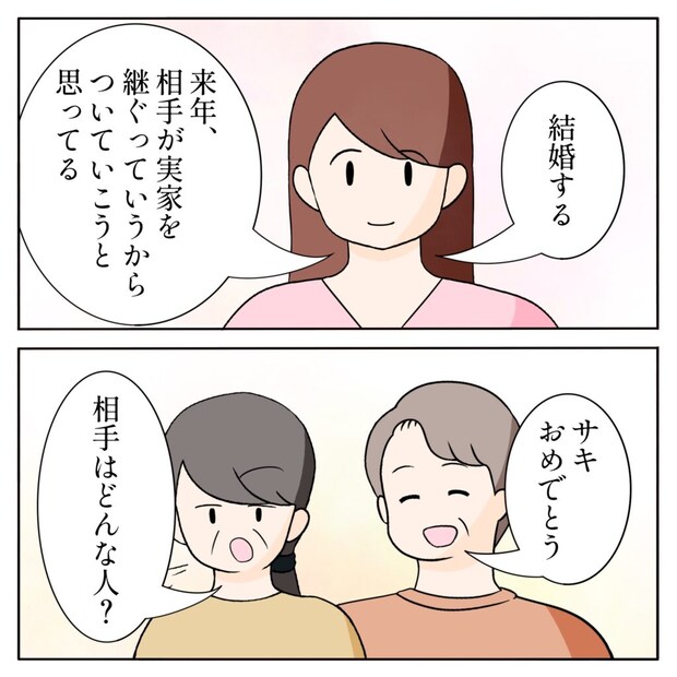 母から結婚しないのか聞かれたので、私は「結婚する。来年、相手が実家を継ぐっていうからついて行こうと思ってる」と報告しました。父はすぐに「サキおめでとう」と言ってくれました。「相手はどんな人?」と母に聞かれ