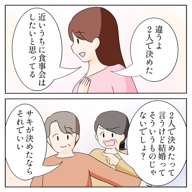 「違うよ。2人で決めた。」と断言しました。今はもう、何でも話せて信頼し合える人が寄り添ってくれているのです。近いうちに食事会をしたいと伝えると、母は「2人で決めたって言うけど、結婚ってそういうものじゃないでしょ?」と言って、まだ何か言おうとしていましたが父が遮りました。「サキが決めたならそれでいい。」父は優しい笑顔で、ハッキリと言ってくれました。