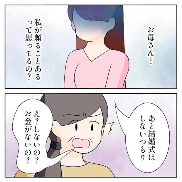 私が母を頼ることがあると思っているのかな。口にはしなかったけれど、そう思いました。それから、結婚式はしないつもりであることも伝えると、母はお金が無いのかと驚いていました。