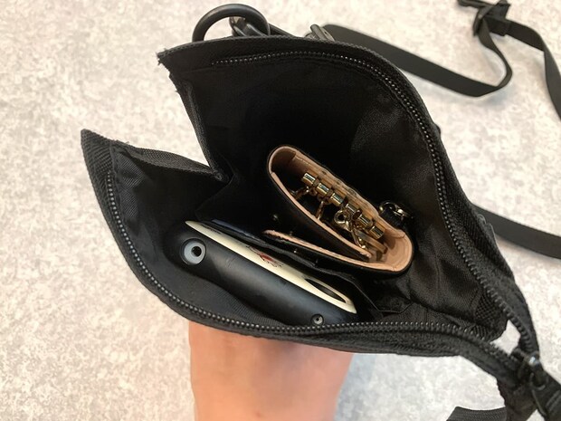 試しに、外出時に必ず持ち運ぶスマホとキーケースを入れてみました。まだ少し余裕があるので、リップクリームや小さいハンドジェルなども入れられるサイズ感です。