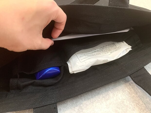 さらに、バッグの内側にも収納スペースが用意されています。日常的に使用する日焼け止めクリームや子供の手口拭きを入れてみましたが、容量があるので問題なく収納できました♪