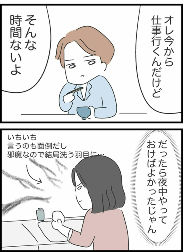ようやくしょうたが皿を洗ったかと思ったようこでしたが、実際は箸を取っただけ。「昨日の食器そのまま」と伝えると「仕事に行くからそんな時間ないよ」と言われ…。