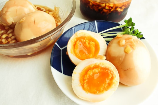 料理家・発酵マイスターの榎本美沙さん直伝「黒酢ネギだれ」にひと晩漬けた「ネギだれ味玉」がこちら。半分に切ってみると、黄身がとろっとした半熟状に仕上がっています。