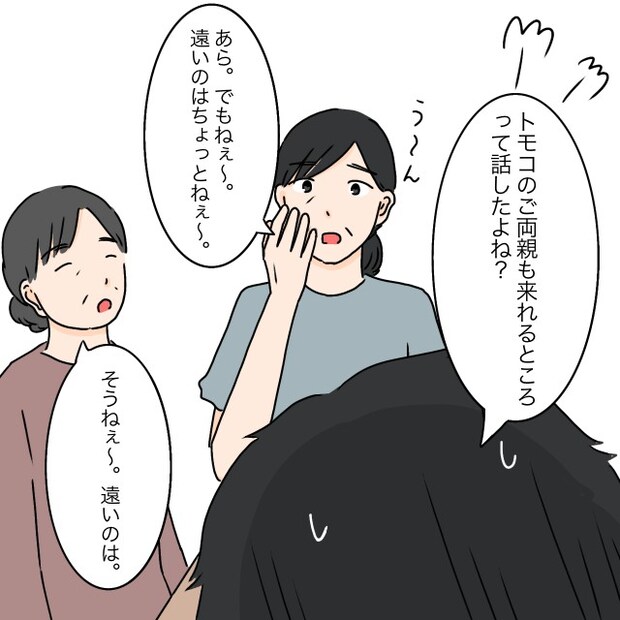 夫が「トモコのご両親も来れるところって話したよね?」と怒り気味に言うも、義母は「あら。でもね~、遠いのはちょっとね~」と不服そう。親戚の女性も「そうねぇ~。遠いのは」と義母と同じ意見のようです。