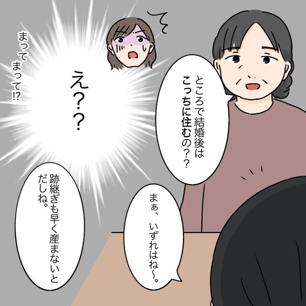 家のルールって何?と戸惑っていると、親戚の女性が「ところで、結婚後はこっちに住むの?」と聞きました。すると義母はためらうことなく「まぁいずれはね~」とさらりと答えたのです。そんな話は一切聞いていなかった私は「え??まってまって!?」と心の中で大パニック。そんな私にお構いなしに親戚の女性は「跡継ぎも早く産まないとだしね」と当然のように言いました。