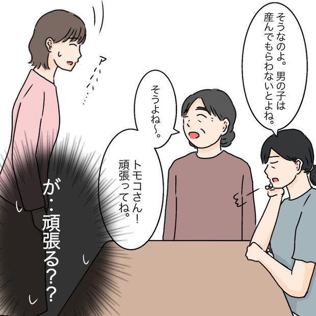 義母も「そうなのよ。男の子は産んでもらわないとよね」と溜息まじりに言い、親戚の女性から「トモコさん!頑張ってね」と応援された私はアハハと苦笑いするのが精一杯。が・・頑張る??男の子を産むのが絶対条件なの??