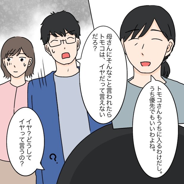 義母は私の方を向くと「トモコさんもうちに入るわけだし。うち優先でいいわよね」とにっこり。夫は「母さんにそんなこと言われたらトモコはイヤだって言えないだろ?」と庇ってくれましたが、義母は「イヤ?どうしてイヤって言うの?」ときょとんとしていました。義母の言葉からは、嫁が義母の言うことを拒否するなどあり得ないという考えが強く感じられました。