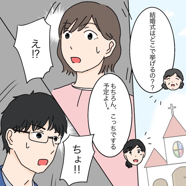 親戚の質問は止まりません。「結婚式はどこで挙げるの??」と聞く親戚に、義母は「もちろん、こっちでする予定よ~」ときっぱり。義母の返答を聞いた私は「え!?」と驚き、夫も「ちょ!!」と大慌て。