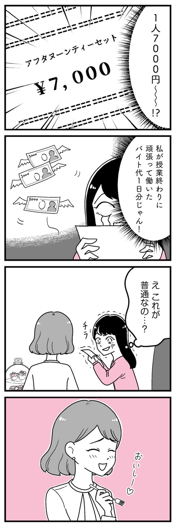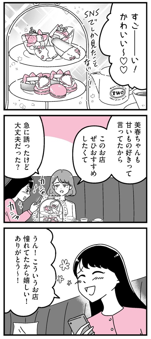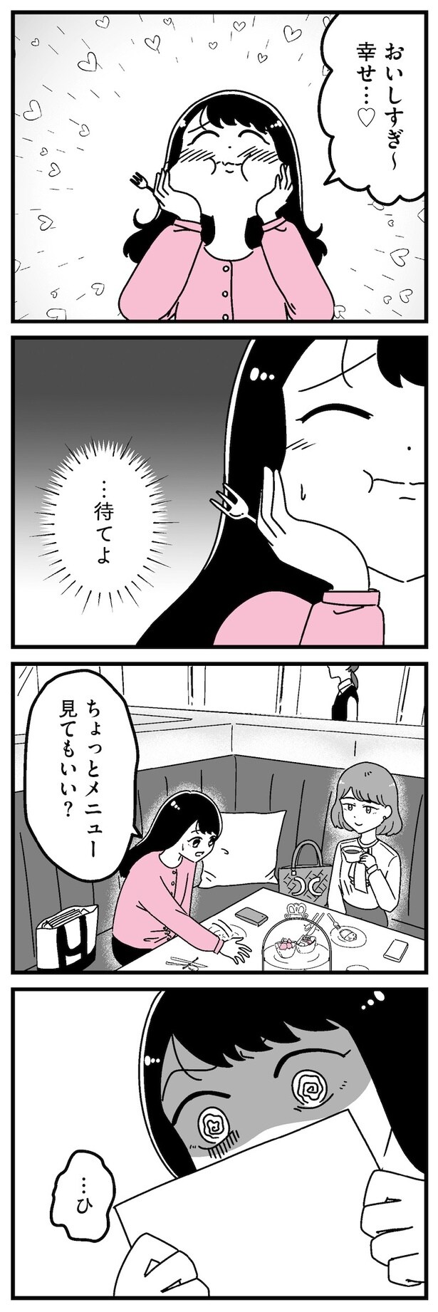 前回、働いても働いてもカツカツな生活に理想とのギャップを感じていた美春。ある日、桜子が美春におすすめしたいとカフェに誘ってくれた。メニューも見ずに注文したアフタヌーンティーの金額を恐る恐る確かめると…。
