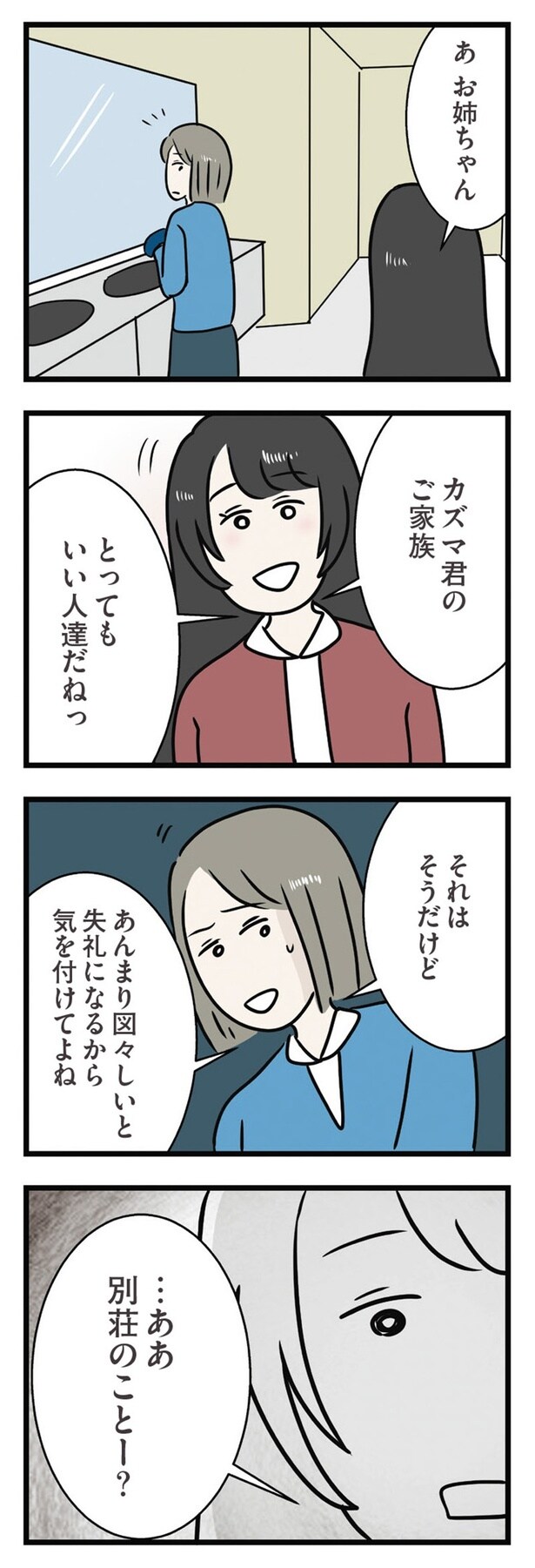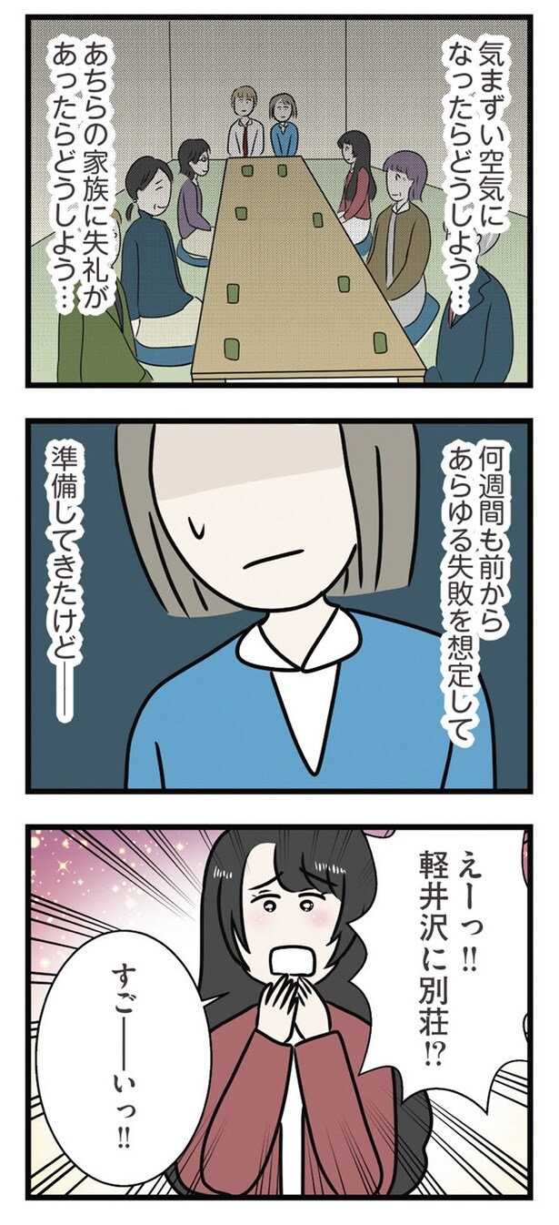 前回、カズマがスマホを触る時間が増えたことに気付いたエリ。後日、両家の顔合わせが行われた。失礼がないようにと失敗を想定して何週間も前から準備をしていたエリ。しかし、両家の顔合わせでもやはりまりあが話題の中心になり…。