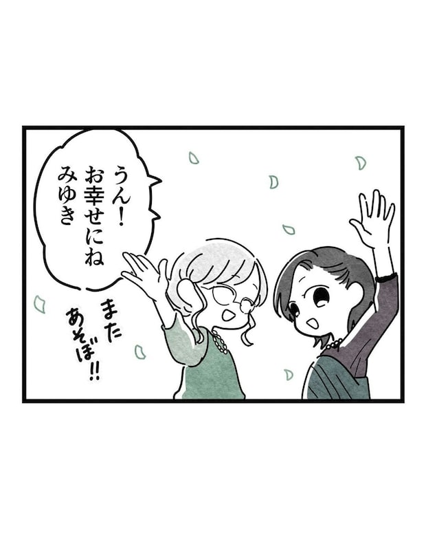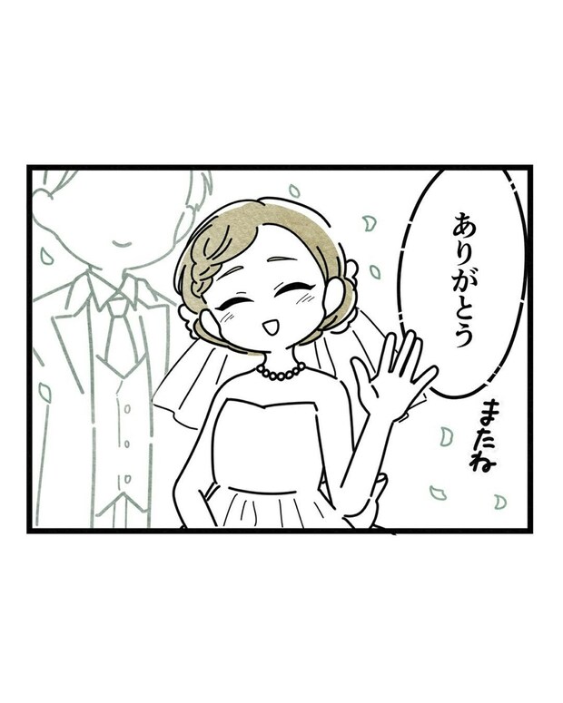 友人みゆきさんの結婚式が終わり、お見送りを受けるさほさんと、ふうかさん。