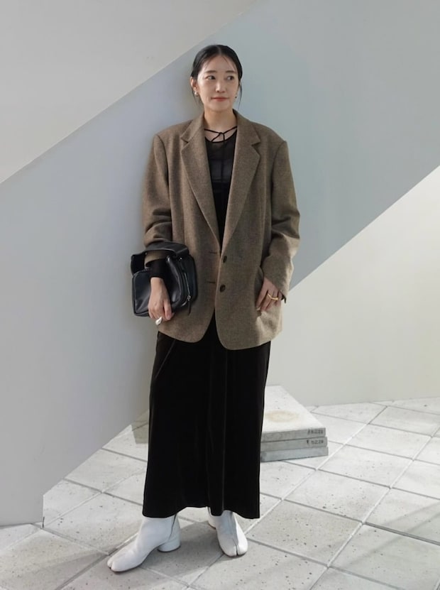 「3色の糸をミックスさせた、奥行きあるヘリンボーン柄生地のオーバージャケット。メンズライクなディテールでこなれ感を出しつつ、インナーのシアー感で女っぽさもプラスしました。シックだけどモダンな雰囲気のあるスタイルにまとめています」