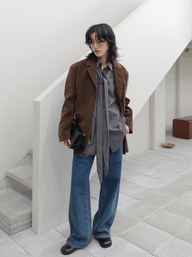 「マニッシュなスタイルが好きなので、メンズライクなスエードのオーバージャケットにカジュアルなデニムを合わせて、ラフにコーディネートしました。チェックシャツのタイでスタイリングに動きをつけたのもポイントです」