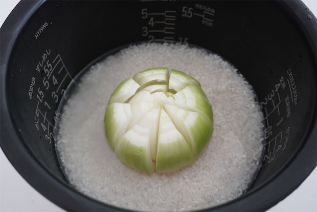 2. 米を洗って炊飯器の内釜に入れて平らにならし、中心に玉ねぎをヘタを下にして置いて2合の目盛りまで水を入れる。