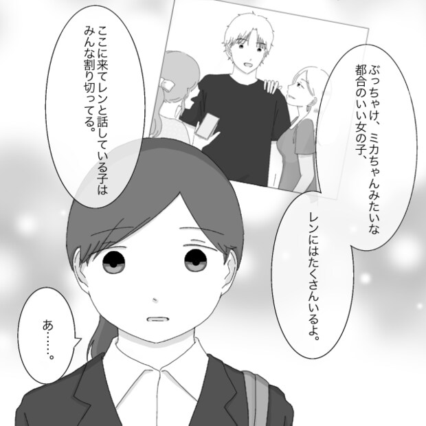 「ぶっちゃけ、ミカちゃんみたいな都合のいい女の子、レンにはたくさんいるよ。ここに来てレンと話している子はみんな割り切ってる」とアツシくんに言われ、バスケの集まりのときいつも女の子に囲まれていたレンを思い出しました。