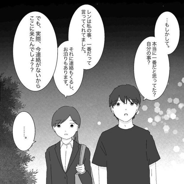 少し落ち着いた私に、アツシくんは「・・もしかして。本当に一番だと思ってた?自分の事?」と静かに聞いてきました。私は「レンは私の事、一番だって言ってくれてました。それに連絡も来るし、お泊まりもあります」と必死にアツシくんの言葉を否定しようとしますが「でも、実際、今連絡がないからここに来たんでしょ?」と言われ何も言い返せませんでした。
