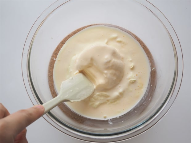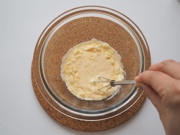 一生懸命混ぜ合わせましたが、この時点でわたしのボウルには少し粒が残っているように見えて若干モヤモヤ…。しかし、4、5の工程を進めていくと無くなっていったので、同じような状況になっても心配せずに進めてみてください。