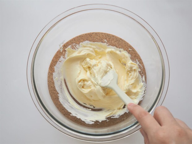 1. 耐熱ボウルにクリームチーズを入れ、練るようにしながらなめらかにする。
