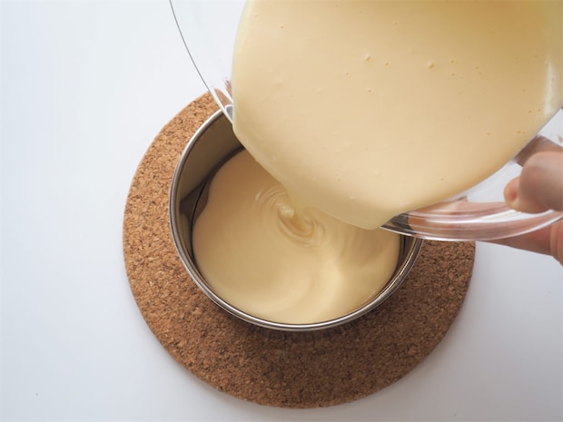 6. ケーキ型の底にクッキングシートを引き、5の生地を流し入れる。冷蔵庫で3時間以上、しっかりと冷やし固める。