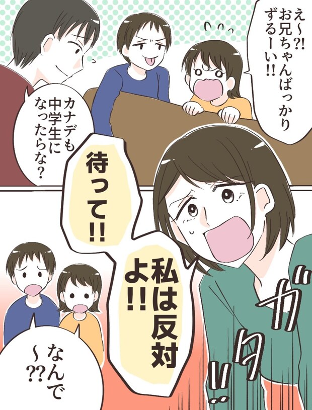 カナデが「お兄ちゃんばっかりずるーい!」と拗ねだしました。そりゃそうなるわよね。「カナデも中学生になったらな?」というショウヘイの言葉を聞いて私は慌てて「待って!」と立ち上がりました。この家に何台テレビを置くつもり?このままだとすぐにでもヒロキの部屋にテレビが設置されそうだったので「私は反対よ!!」とハッキリ言いました。