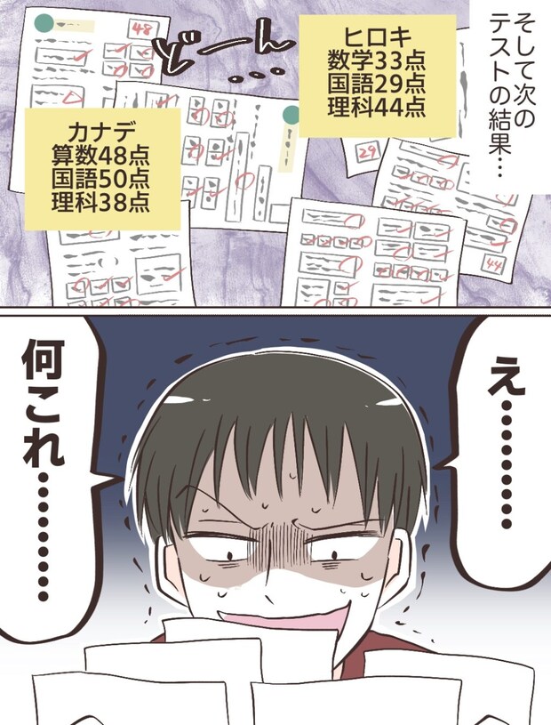 そして、テレビをかけたテスト結果が戻ってきました。2人の散々な点数を並べて、ショウヘイは愕然としました。「え・・・何これ・・・」ショウヘイが想像もしていなかったほどひどい点数だったようです。