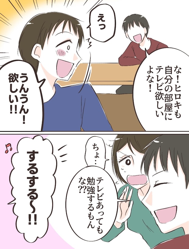 ショウヘイはヒロキに「自分の部屋にテレビ欲しいよな!」と声をかけました。テレビに夢中だったヒロキは目を輝かせて振り向くと、「うんうん!欲しい!」と嬉しそうです。「テレビあっても勉強するもんな?」というショウヘイの言葉に「するする~!」と明らかに調子が良いだけの返事。