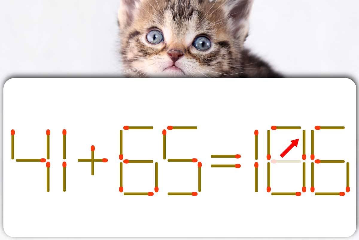 「166」中央の「6」の、横向きのマッチ棒を取りましょう。取ったマッチ棒を縦にして右上に置きます。すると、数字が「106」に変化。これにより「41+65=106」と、式が正しくなりました。