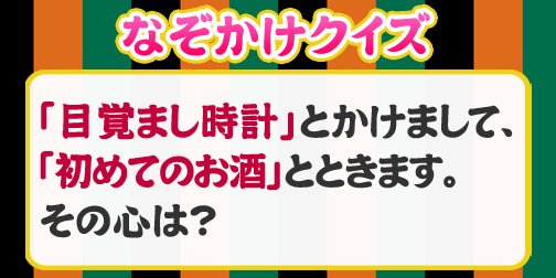 毎日配信の頭をやわらか~くしてくれる脳トレクイズです。今日の問題は「なぞかけクイズ」。一瞬のひらめきで、2つの言葉に隠されたある共通点を見つけてみよう!【問題】「目覚まし時計」とかけまして、「初めてのお酒」とときます。その心は?こたえをみる【答】「どちらも「おとなって」気づきます。(音鳴って・大人って)」。スッキリ解けましたか?
