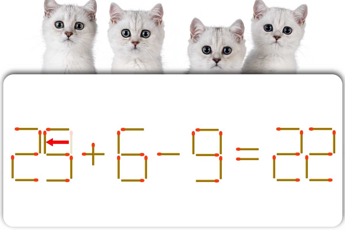 まず左の「23」から「3」の右上にある縦向きのマッチ棒を取ります。これをそのまま左にすーっとスライドさせると……「5」にチェンジ! 数字が「25」になりました。あっという間に「25+6-9=22」の式が成立し、調整ができましたね♪