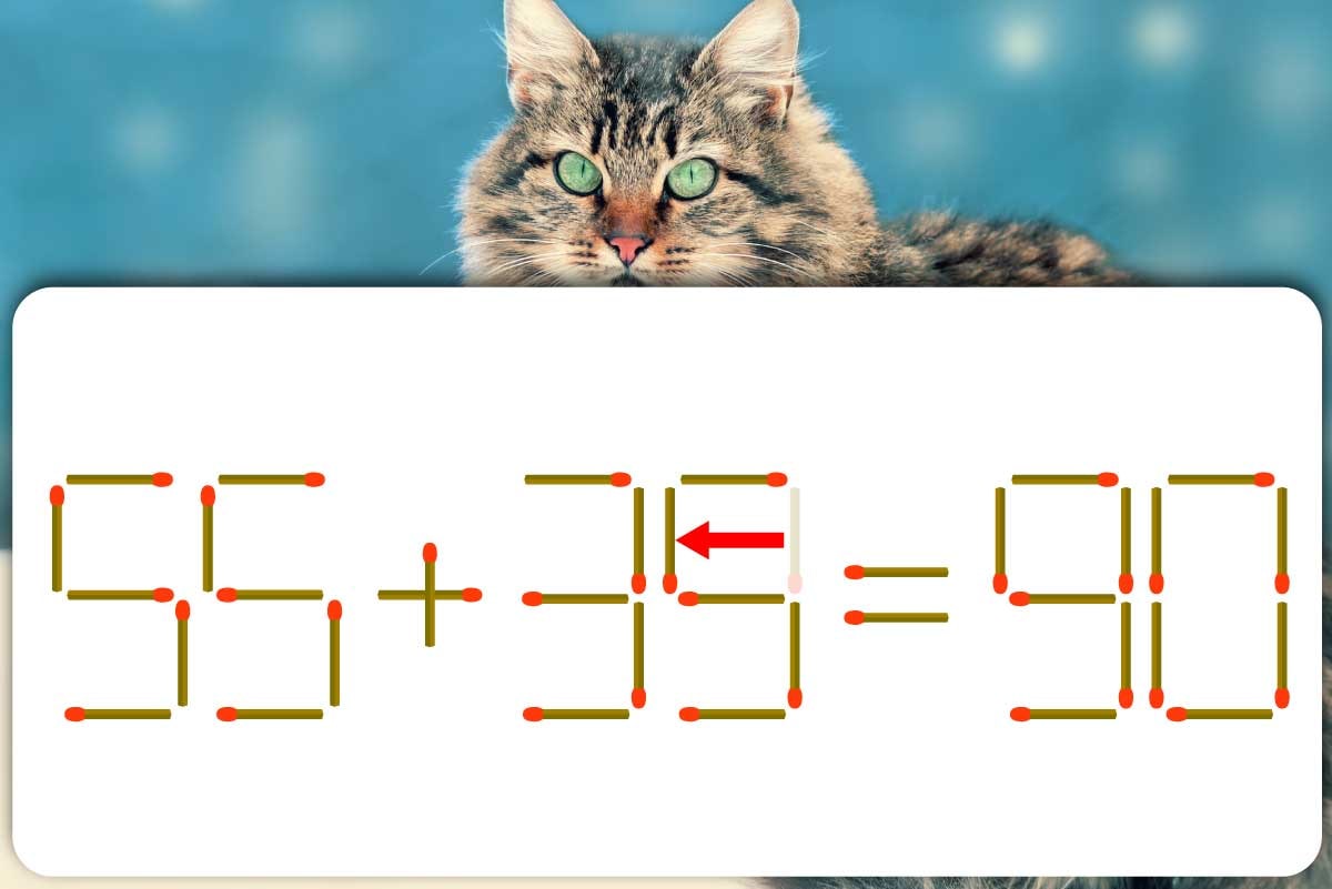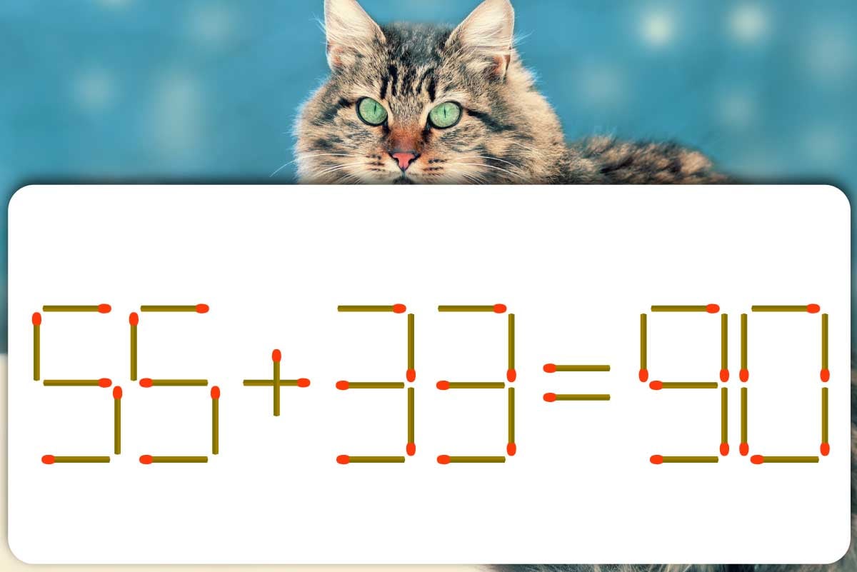 「33」の右側の「3」の、右上のマッチ棒を左にスライドさせて「5」にし、「55+35=90」にする。※解答は複数ある場合があります。