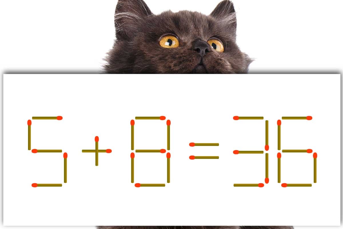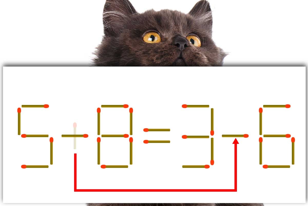「+」のマッチ棒を1本、「36」の間に移動させて「-」を作り、「5-8=3-6」にする。※解答は複数ある場合があります。