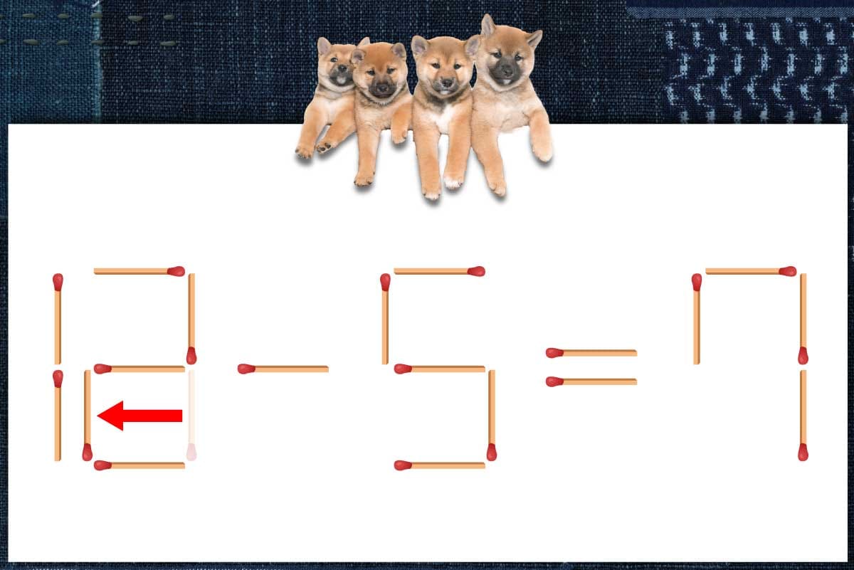 「3」のマッチ棒を1本移動させて「2」を作り、「12-5=7」にする。※解答は複数ある場合があります。