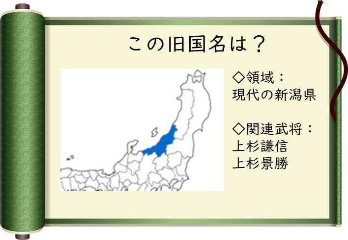 【答】 越後(えちご)略称は越州。上杉謙信の本領。次代の景勝が関ヶ原の戦いで西軍につき、領地召し上げとなりました。