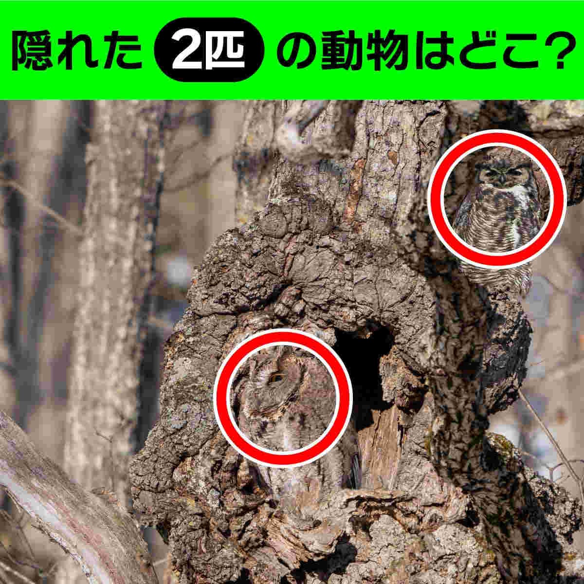 隠れた動物は、画像中央、下部と、画像右側、上部の「フクロウ」でした!