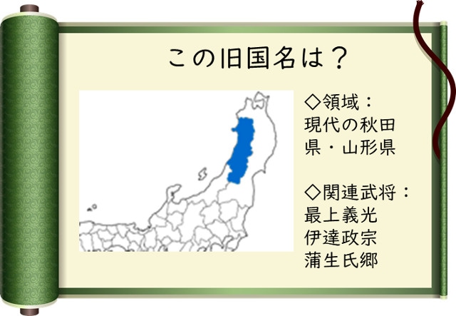 【答】 出羽(でわ)略称は羽州。最上氏・伊達氏・上杉氏が勢力を競い、豊臣秀吉の天下統一後は、一時蒲生氏郷も領地を持ちました。関ヶ原の戦いの結果、最上氏・上杉氏・佐竹氏などが領地を持ち、このうち最上氏は後に改易。