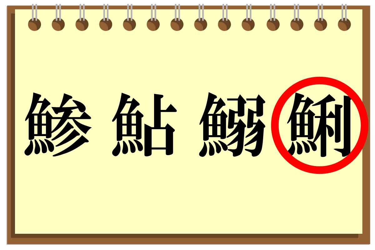 【答】「鯏」が仲間はずれ。他は、鯵(アジ)、鮎(アユ)、鰯(イワシ)。鯏(アサリ)は、同じ「さかなへん」でも、「貝」の仲間なので、魚の仲間ではない。