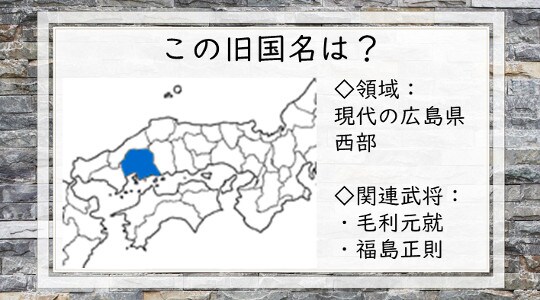【答】 安芸(あき)略称は芸州。弱小の国人領主であった毛利元就が、吉川氏・小早川氏の勢力を取り込んで国主にまで成長。毛利氏は関ヶ原の戦いで西軍についたため、領地召し上げとなり、福島正則が移封されました。