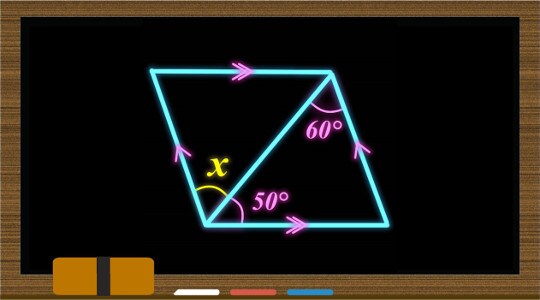 平行四辺形の対角は等しくなることに気づけばあとは簡単。右の三角形の角度が60°と50°とわかっているので、残りの右下の角度は180-60-50=70°。平行四辺形を含めた四角形の内角の和は360°ですから、xを含む角度は(360-70-70)÷2=110°です。つまり、xは110-50=60°となるのです。