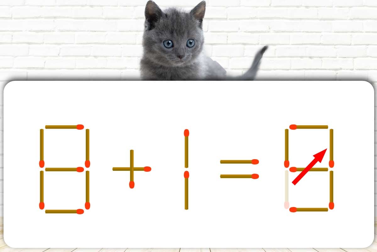 「6」の左下にある縦向きのマッチ棒を取ります。抜き取ったマッチ棒を縦向きのまま、右上に移動してみましょう。するとたちまち数字が「9」になり、式が「8+1=9」と見事に一致しました!