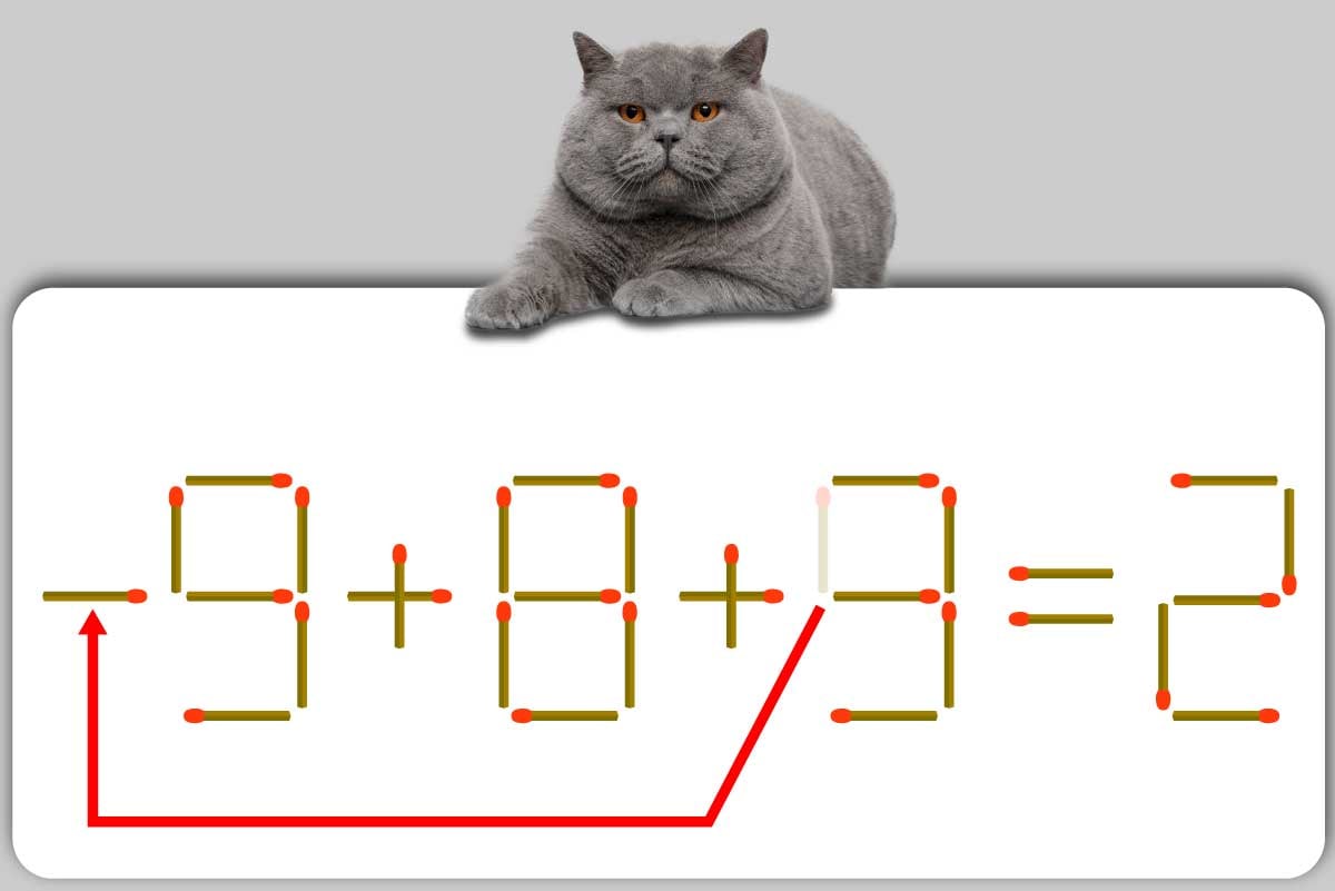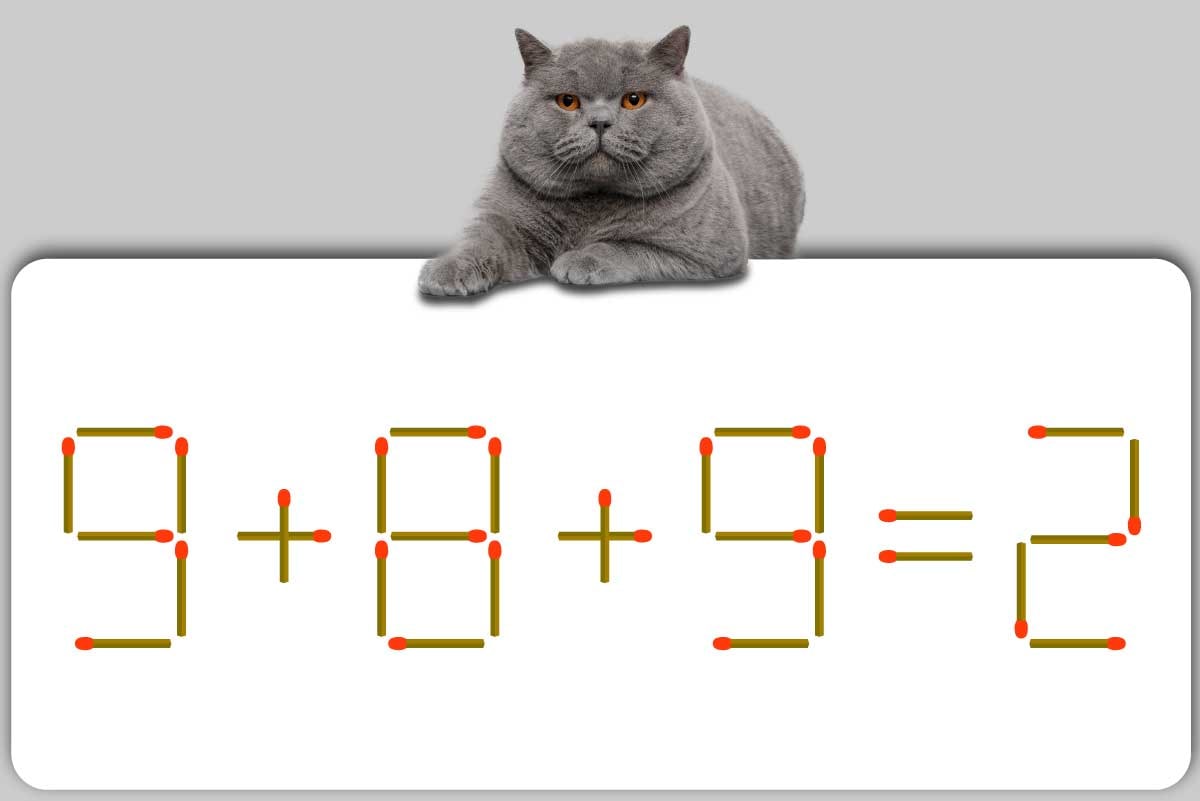 「9」のマッチ棒を1本、もう1つの「9」の前に移動させて「-」を作り、「-9+8+3=2」にする。※解答は複数ある場合があります。