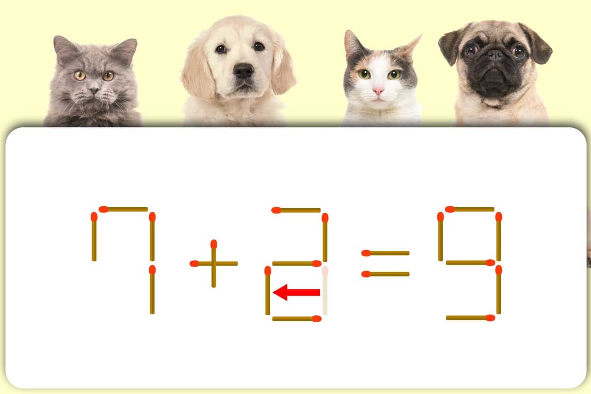 まず「3」に注目してください。右下にある縦のマッチ棒をそのまま左にスライドさせます。すると、たちまち数字が「2」になりました!出来上がった「7+2=9」を計算してみると、答えが一致します♪