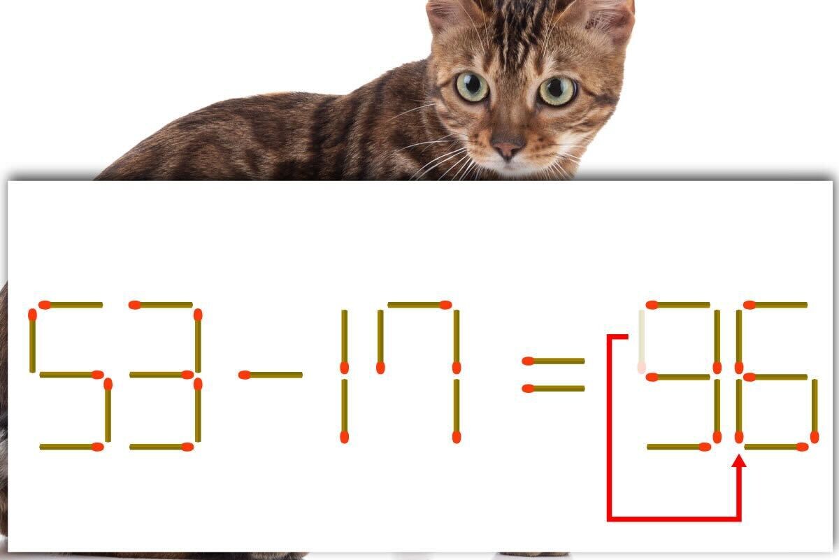 「9」のマッチ棒を、右隣の「5」に移動させて「6」を作り、「53-17=36」にする。※解答は複数ある場合があります。