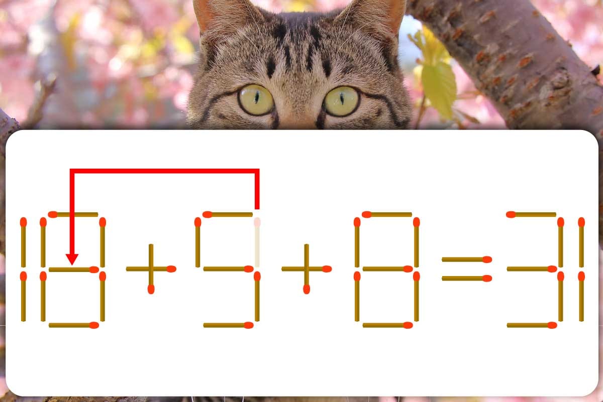 式の中央にある「9」の右上にある縦のマッチ棒を取り、数字を「5」にします。そしてマッチを横に回転!左の「10」にある「0」の中にマッチ棒を足し数字を「18」にしましょう。すると、式が「18+5+8=31」になり、正しい計算式となりました!