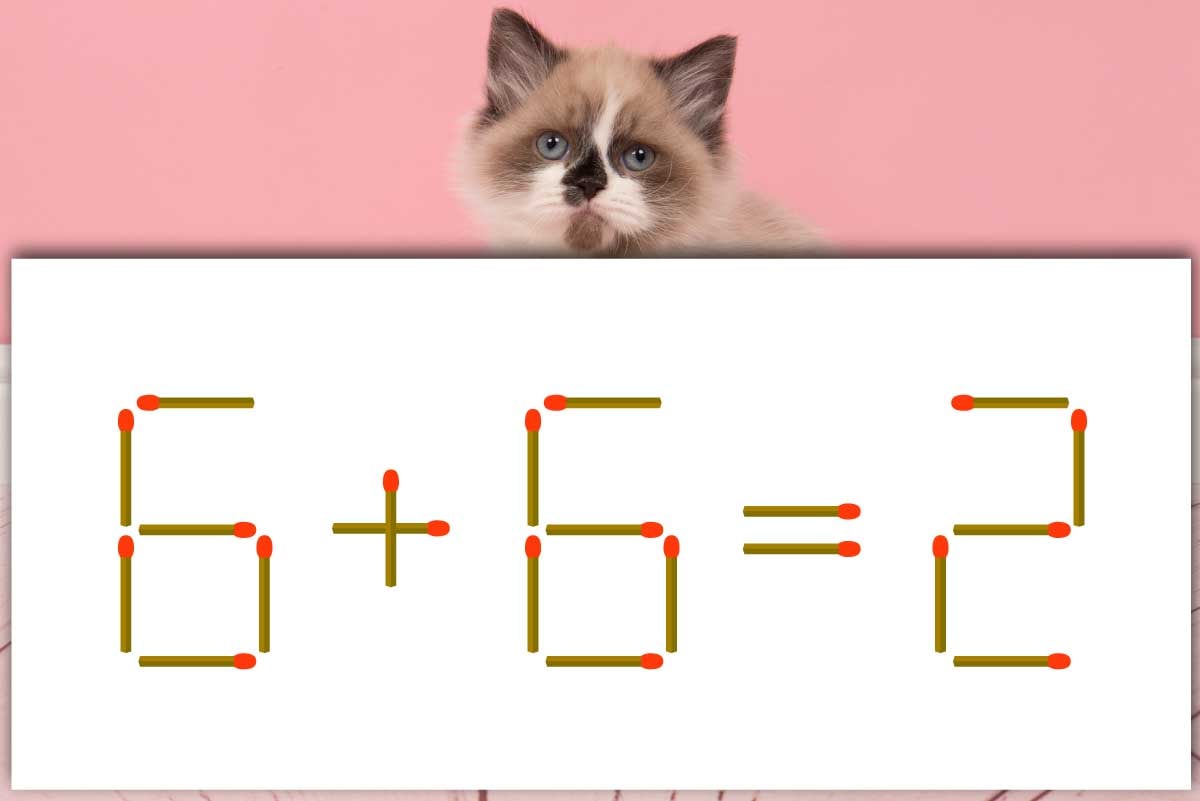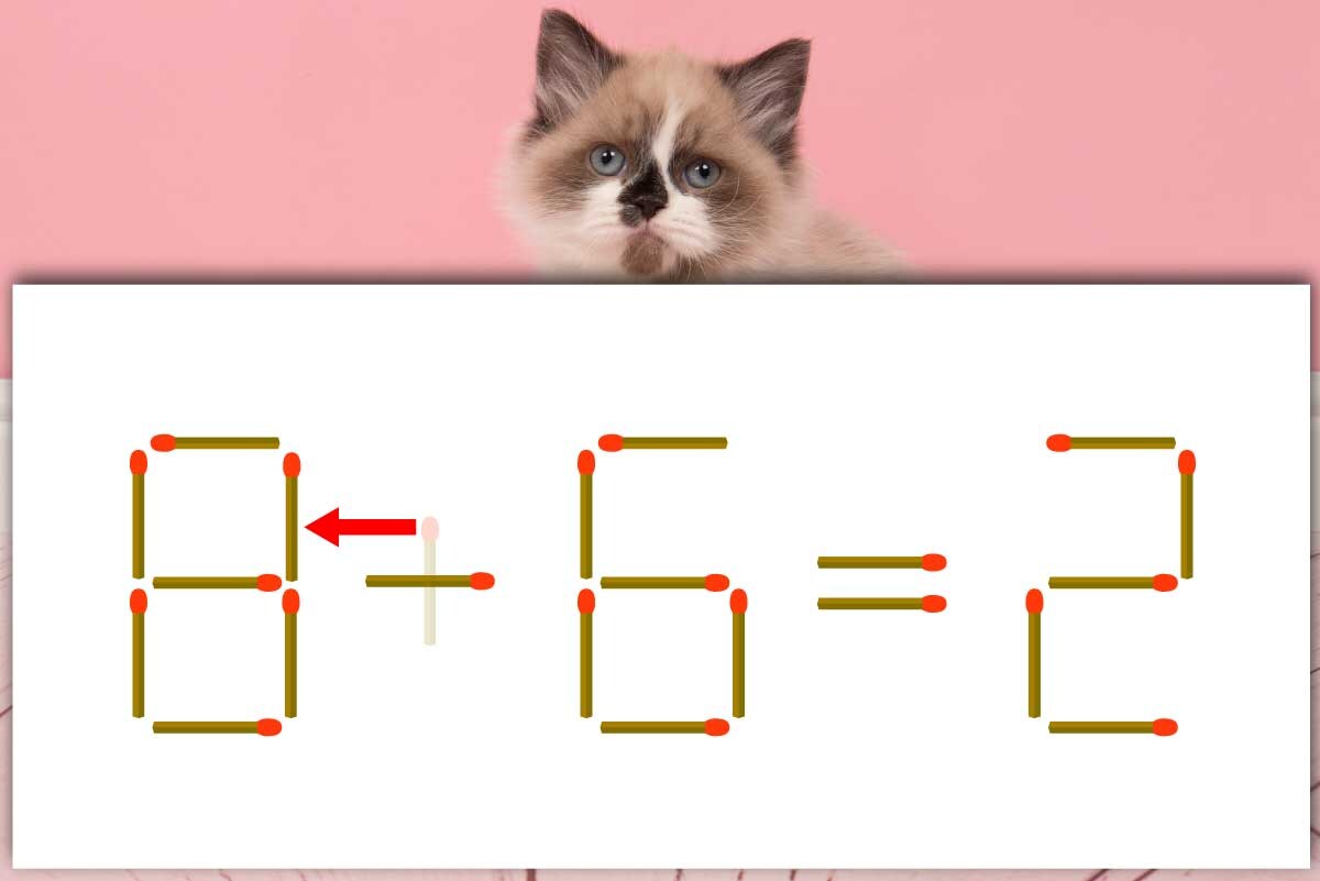 まず、「+」の縦向きのマッチ棒を取ります。取ったマッチ棒を、左側の「6」の右上にくっつけ、「8」へ変化させましょう。すると、式が「8-6=2」に変わり、両辺が一致しました。