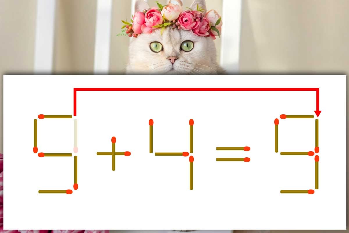 左の「9」の右上のマッチ棒を取り、「5」にします。取ったマッチ棒を右の「5」の右上にくっつけ、「9」に変化させましょう。すると、式が「5+4=9」になり、成立しました!