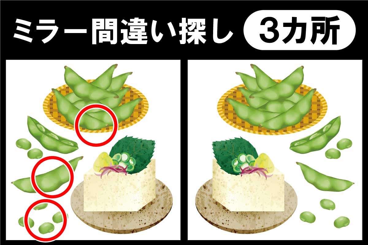 3カ所の違いは、1.ザルの大きさ、2.枝豆の大きさ、3.手前の豆の数